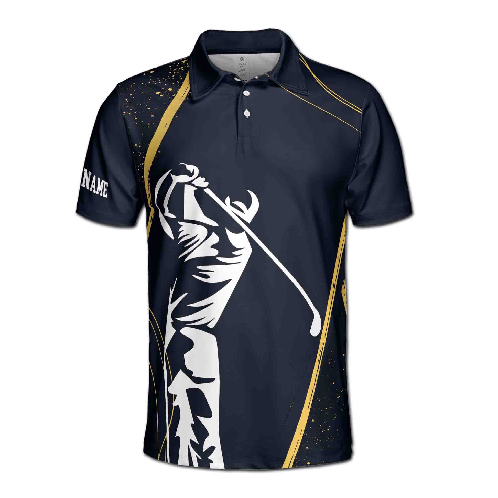 Custom Name Stylized Golf Player Swing Golden Spatter Men's Polo Shirt S-5XL